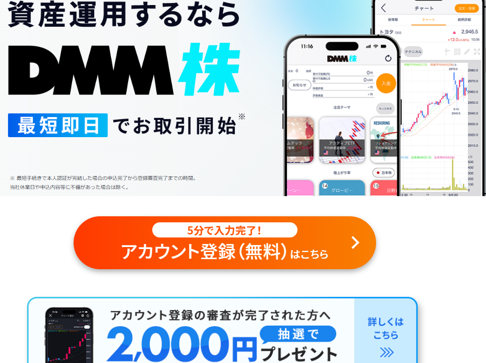初心者も安心!サポート充実の【DMM 株】(PR)DMM株は日本株も米国株もNISAも対応しており、アプリの使いやすさとポイント還元で初心者にも始めやすいサービスです。まずは口座開設(無料)で準備しておくと良いと思います。 ※※投資は元本が保証されるものではありません。商品性やリスクを理解した上でご判断ください。
