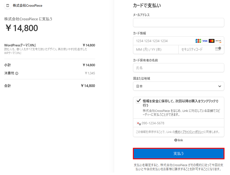 ④クレジットなど必要項目を記入し『支払う』をクリック